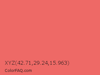 XYZ 42.71,29.24,15.963 Color is a light red color and the nearest color is Sunglo #e16865. Hex code #ee6966 and RGB value is rgb(238,105,102). In RGB color space, this color is composed of 93% red, 41% green, 40% blue, In CMYK color space, this color is composed of 0% cyan, 56% magenta, 57% yellow , 7% black , In HSL color space, this color has a hue angle of 1° , 80% saturation and 67% lightness.