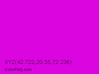 XYZ 42.722,20.55,72.236 Color is a normal magenta color and the nearest color is Deep Magenta #cc00cc. Hex code #db05e0 and RGB value is rgb(219,5,224). In RGB color space, this color is composed of 86% red, 2% green, 88% blue, In CMYK color space, this color is composed of 2% cyan, 98% magenta, 0% yellow , 12% black , In HSL color space, this color has a hue angle of 299° , 96% saturation and 45% lightness.