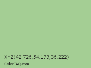 XYZ 42.726,54.173,36.222 Color is a light green color and the nearest color is Feijoa #9fdd8c. Hex code #a4ce94 and RGB value is rgb(164,206,148). In RGB color space, this color is composed of 64% red, 81% green, 58% blue, In CMYK color space, this color is composed of 20% cyan, 0% magenta, 28% yellow , 19% black , In HSL color space, this color has a hue angle of 103° , 37% saturation and 69% lightness.