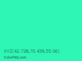 XYZ 42.728,70.439,55.06 Color is a normal green color and the nearest color is Turquoise PWG #30d5c8. Hex code #2ef7b5 and RGB value is rgb(46,247,181). In RGB color space, this color is composed of 18% red, 97% green, 71% blue, In CMYK color space, this color is composed of 81% cyan, 0% magenta, 27% yellow , 3% black , In HSL color space, this color has a hue angle of 160° , 93% saturation and 57% lightness.