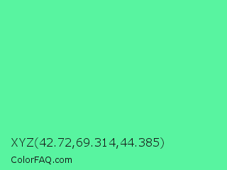 XYZ 42.72,69.314,44.385 Color is a light green color and the nearest color is Medium Aquamarine #66ddaa. Hex code #58f4a0 and RGB value is rgb(88,244,160). In RGB color space, this color is composed of 35% red, 96% green, 63% blue, In CMYK color space, this color is composed of 64% cyan, 0% magenta, 34% yellow , 4% black , In HSL color space, this color has a hue angle of 148° , 88% saturation and 65% lightness.