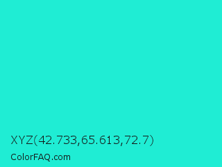 XYZ 42.733,65.613,72.7 Color is a normal cyan color and the nearest color is Bright Turquoise #08e8de. Hex code #1fedd4 and RGB value is rgb(31,237,212). In RGB color space, this color is composed of 12% red, 93% green, 83% blue, In CMYK color space, this color is composed of 87% cyan, 0% magenta, 11% yellow , 7% black , In HSL color space, this color has a hue angle of 173° , 85% saturation and 53% lightness.