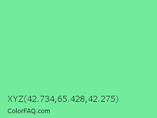 XYZ 42.734,65.428,42.275 Color is a light green color and the nearest color is Medium Aquamarine #66ddaa. Hex code #72eb9d and RGB value is rgb(114,235,157). In RGB color space, this color is composed of 45% red, 92% green, 62% blue, In CMYK color space, this color is composed of 51% cyan, 0% magenta, 33% yellow , 8% black , In HSL color space, this color has a hue angle of 141° , 75% saturation and 68% lightness.