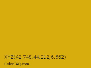 XYZ 42.748,44.212,6.662 Color is a normal yellow color and the nearest color is Galliano #dcb20c. Hex code #d6ad0d and RGB value is rgb(214,173,13). In RGB color space, this color is composed of 84% red, 68% green, 5% blue, In CMYK color space, this color is composed of 0% cyan, 19% magenta, 94% yellow , 16% black , In HSL color space, this color has a hue angle of 48° , 89% saturation and 45% lightness.