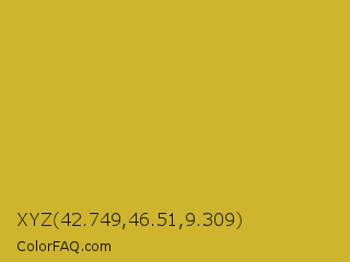 XYZ 42.749,46.51,9.309 Color is a normal yellow color and the nearest color is Gold Metallic #d4af37. Hex code #cfb52e and RGB value is rgb(207,181,46). In RGB color space, this color is composed of 81% red, 71% green, 18% blue, In CMYK color space, this color is composed of 0% cyan, 13% magenta, 78% yellow , 19% black , In HSL color space, this color has a hue angle of 50° , 64% saturation and 50% lightness.