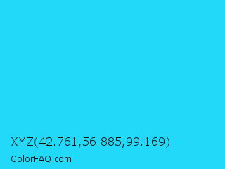 XYZ 42.761,56.885,99.169 Color is a normal cyan color and the nearest color is Loeen #15f2fd. Hex code #23d9fa and RGB value is rgb(35,217,250). In RGB color space, this color is composed of 14% red, 85% green, 98% blue, In CMYK color space, this color is composed of 86% cyan, 13% magenta, 0% yellow , 2% black , In HSL color space, this color has a hue angle of 189° , 96% saturation and 56% lightness.