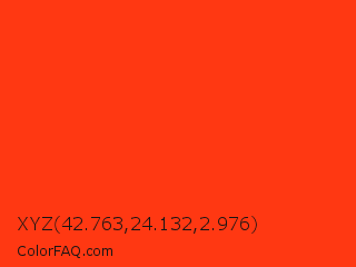 XYZ 42.763,24.132,2.976 Color is a normal red color and the nearest color is Red RYB #fe2712. Hex code #ff3812 and RGB value is rgb(255,56,18). In RGB color space, this color is composed of 100% red, 22% green, 7% blue, In CMYK color space, this color is composed of 0% cyan, 78% magenta, 93% yellow , 0% black , In HSL color space, this color has a hue angle of 10° , 100% saturation and 54% lightness.
