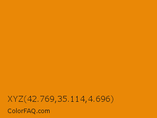 XYZ 42.769,35.114,4.696 Color is a normal orange color and the nearest color is Fulvous #e48400. Hex code #ea8806 and RGB value is rgb(234,136,6). In RGB color space, this color is composed of 92% red, 53% green, 2% blue, In CMYK color space, this color is composed of 0% cyan, 42% magenta, 97% yellow , 8% black , In HSL color space, this color has a hue angle of 34° , 95% saturation and 47% lightness.
