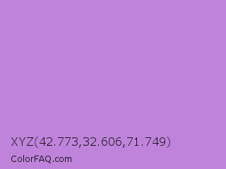 XYZ 42.773,32.606,71.749 Color is a light purple color and the nearest color is Lavender #b57edc. Hex code #c083dc and RGB value is rgb(192,131,220). In RGB color space, this color is composed of 75% red, 51% green, 86% blue, In CMYK color space, this color is composed of 13% cyan, 40% magenta, 0% yellow , 14% black , In HSL color space, this color has a hue angle of 281° , 56% saturation and 69% lightness.