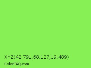 XYZ 42.791,68.127,19.489 Color is a light green color and the nearest color is Kiwi #8ee53f. Hex code #87f055 and RGB value is rgb(135,240,85). In RGB color space, this color is composed of 53% red, 94% green, 33% blue, In CMYK color space, this color is composed of 44% cyan, 0% magenta, 65% yellow , 6% black , In HSL color space, this color has a hue angle of 101° , 84% saturation and 64% lightness.