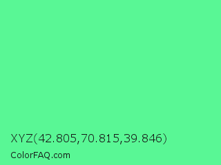 XYZ 42.805,70.815,39.846 Color is a light green color and the nearest color is Very Light Malachite Green #64e986. Hex code #59f795 and RGB value is rgb(89,247,149). In RGB color space, this color is composed of 35% red, 97% green, 58% blue, In CMYK color space, this color is composed of 64% cyan, 0% magenta, 40% yellow , 3% black , In HSL color space, this color has a hue angle of 143° , 91% saturation and 66% lightness.
