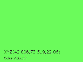 XYZ 42.806,73.519,22.06 Color is a light green color and the nearest color is Screamin Green #66ff66. Hex code #6bfc5c and RGB value is rgb(107,252,92). In RGB color space, this color is composed of 42% red, 99% green, 36% blue, In CMYK color space, this color is composed of 58% cyan, 0% magenta, 63% yellow , 1% black , In HSL color space, this color has a hue angle of 114° , 96% saturation and 67% lightness.