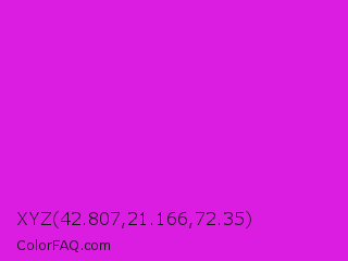 XYZ 42.807,21.166,72.35 Color is a normal magenta color and the nearest color is Steel Pink #cc33cc. Hex code #da1de0 and RGB value is rgb(218,29,224). In RGB color space, this color is composed of 85% red, 11% green, 88% blue, In CMYK color space, this color is composed of 3% cyan, 87% magenta, 0% yellow , 12% black , In HSL color space, this color has a hue angle of 298° , 77% saturation and 50% lightness.