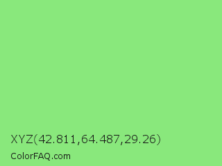 XYZ 42.811,64.487,29.26 Color is a light green color and the nearest color is Pastel Green #77dd77. Hex code #89e87c and RGB value is rgb(137,232,124). In RGB color space, this color is composed of 54% red, 91% green, 49% blue, In CMYK color space, this color is composed of 41% cyan, 0% magenta, 47% yellow , 9% black , In HSL color space, this color has a hue angle of 113° , 70% saturation and 70% lightness.