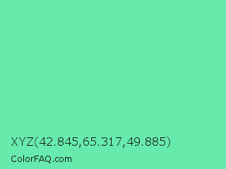 XYZ 42.845,65.317,49.885 Color is a light green color and the nearest color is Medium Aquamarine #66ddaa. Hex code #67ebad and RGB value is rgb(103,235,173). In RGB color space, this color is composed of 40% red, 92% green, 68% blue, In CMYK color space, this color is composed of 56% cyan, 0% magenta, 26% yellow , 8% black , In HSL color space, this color has a hue angle of 152° , 77% saturation and 66% lightness.
