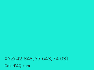 XYZ 42.848,65.643,74.03 Color is a normal cyan color and the nearest color is Bright Turquoise #08e8de. Hex code #1aedd6 and RGB value is rgb(26,237,214). In RGB color space, this color is composed of 10% red, 93% green, 84% blue, In CMYK color space, this color is composed of 89% cyan, 0% magenta, 10% yellow , 7% black , In HSL color space, this color has a hue angle of 173° , 85% saturation and 52% lightness.