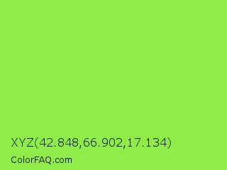 XYZ 42.848,66.902,17.134 Color is a light green color and the nearest color is Kiwi #8ee53f. Hex code #8fed4a and RGB value is rgb(143,237,74). In RGB color space, this color is composed of 56% red, 93% green, 29% blue, In CMYK color space, this color is composed of 40% cyan, 0% magenta, 69% yellow , 7% black , In HSL color space, this color has a hue angle of 95° , 82% saturation and 61% lightness.