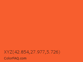XYZ 42.854,27.977,5.726 Color is a normal red color and the nearest color is Flamingo #f2552a. Hex code #f75e2e and RGB value is rgb(247,94,46). In RGB color space, this color is composed of 97% red, 37% green, 18% blue, In CMYK color space, this color is composed of 0% cyan, 62% magenta, 81% yellow , 3% black , In HSL color space, this color has a hue angle of 14° , 93% saturation and 57% lightness.