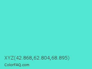 XYZ 42.868,62.804,68.895 Color is a light cyan color and the nearest color is Turquoise #40e0d0. Hex code #50e6cf and RGB value is rgb(80,230,207). In RGB color space, this color is composed of 31% red, 90% green, 81% blue, In CMYK color space, this color is composed of 65% cyan, 0% magenta, 10% yellow , 10% black , In HSL color space, this color has a hue angle of 171° , 75% saturation and 61% lightness.