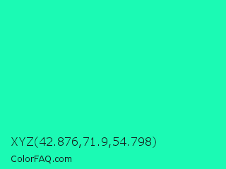XYZ 42.876,71.9,54.798 Color is a normal green color and the nearest color is Medium Spring Green #00fa9a. Hex code #1bfab4 and RGB value is rgb(27,250,180). In RGB color space, this color is composed of 11% red, 98% green, 71% blue, In CMYK color space, this color is composed of 89% cyan, 0% magenta, 28% yellow , 2% black , In HSL color space, this color has a hue angle of 161° , 96% saturation and 54% lightness.