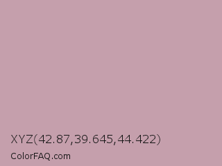 XYZ 42.87,39.645,44.422 Color is a light rose color and the nearest color is Careys Pink #d29eaa. Hex code #c59fac and RGB value is rgb(197,159,172). In RGB color space, this color is composed of 77% red, 62% green, 67% blue, In CMYK color space, this color is composed of 0% cyan, 19% magenta, 13% yellow , 23% black , In HSL color space, this color has a hue angle of 339° , 25% saturation and 70% lightness.