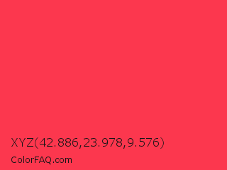 XYZ 42.886,23.978,9.576 Color is a normal red color and the nearest color is Red Salsa #fd3a4a. Hex code #fc374e and RGB value is rgb(252,55,78). In RGB color space, this color is composed of 99% red, 22% green, 31% blue, In CMYK color space, this color is composed of 0% cyan, 78% magenta, 69% yellow , 1% black , In HSL color space, this color has a hue angle of 353° , 97% saturation and 60% lightness.