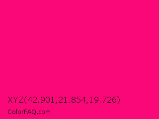 XYZ 42.901,21.854,19.726 Color is a normal rose color and the nearest color is Winter Sky #ff007c. Hex code #fa0878 and RGB value is rgb(250,8,120). In RGB color space, this color is composed of 98% red, 3% green, 47% blue, In CMYK color space, this color is composed of 0% cyan, 97% magenta, 52% yellow , 2% black , In HSL color space, this color has a hue angle of 332° , 96% saturation and 51% lightness.