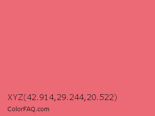 XYZ 42.914,29.244,20.522 Color is a light red color and the nearest color is Light Carmine Pink #e66771. Hex code #ec6976 and RGB value is rgb(236,105,118). In RGB color space, this color is composed of 93% red, 41% green, 46% blue, In CMYK color space, this color is composed of 0% cyan, 56% magenta, 50% yellow , 7% black , In HSL color space, this color has a hue angle of 354° , 78% saturation and 67% lightness.