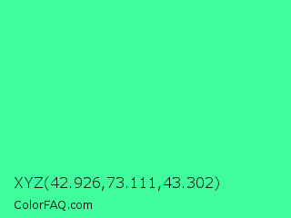 XYZ 42.926,73.111,43.302 Color is a light green color and the nearest color is Eucalyptus #44d7a8. Hex code #40fc9c and RGB value is rgb(64,252,156). In RGB color space, this color is composed of 25% red, 99% green, 61% blue, In CMYK color space, this color is composed of 75% cyan, 0% magenta, 38% yellow , 1% black , In HSL color space, this color has a hue angle of 149° , 97% saturation and 62% lightness.