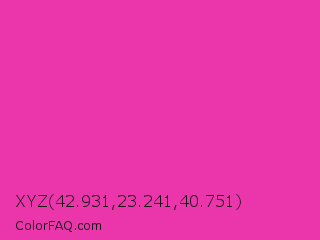 XYZ 42.931,23.241,40.751 Color is a normal magenta color and the nearest color is Frostbite #e936a7. Hex code #eb36ab and RGB value is rgb(235,54,171). In RGB color space, this color is composed of 92% red, 21% green, 67% blue, In CMYK color space, this color is composed of 0% cyan, 77% magenta, 27% yellow , 8% black , In HSL color space, this color has a hue angle of 321° , 82% saturation and 57% lightness.