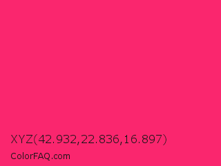 XYZ 42.932,22.836,16.897 Color is a normal rose color and the nearest color is Radical Red #ff355e. Hex code #fa266e and RGB value is rgb(250,38,110). In RGB color space, this color is composed of 98% red, 15% green, 43% blue, In CMYK color space, this color is composed of 0% cyan, 85% magenta, 56% yellow , 2% black , In HSL color space, this color has a hue angle of 340° , 95% saturation and 56% lightness.