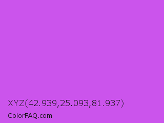 XYZ 42.939,25.093,81.937 Color is a light purple color and the nearest color is Medium Orchid #ba55d3. Hex code #cb54ec and RGB value is rgb(203,84,236). In RGB color space, this color is composed of 80% red, 33% green, 93% blue, In CMYK color space, this color is composed of 14% cyan, 64% magenta, 0% yellow , 7% black , In HSL color space, this color has a hue angle of 287° , 80% saturation and 63% lightness.
