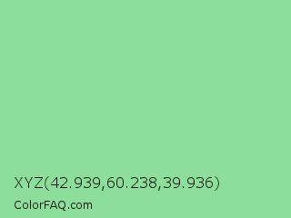 XYZ 42.939,60.238,39.936 Color is a light green color and the nearest color is Granny Smith Apple Crayola #9de093. Hex code #8dde9a and RGB value is rgb(141,222,154). In RGB color space, this color is composed of 55% red, 87% green, 60% blue, In CMYK color space, this color is composed of 36% cyan, 0% magenta, 31% yellow , 13% black , In HSL color space, this color has a hue angle of 130° , 55% saturation and 71% lightness.
