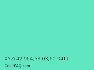 XYZ 42.964,63.03,60.941 Color is a light cyan color and the nearest color is Medium Aquamarine #66ddaa. Hex code #61e6c2 and RGB value is rgb(97,230,194). In RGB color space, this color is composed of 38% red, 90% green, 76% blue, In CMYK color space, this color is composed of 58% cyan, 0% magenta, 16% yellow , 10% black , In HSL color space, this color has a hue angle of 164° , 73% saturation and 64% lightness.