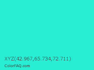 XYZ 42.967,65.734,72.711 Color is a normal cyan color and the nearest color is Turquoise PWG #30d5c8. Hex code #26edd4 and RGB value is rgb(38,237,212). In RGB color space, this color is composed of 15% red, 93% green, 83% blue, In CMYK color space, this color is composed of 84% cyan, 0% magenta, 11% yellow , 7% black , In HSL color space, this color has a hue angle of 172° , 85% saturation and 54% lightness.
