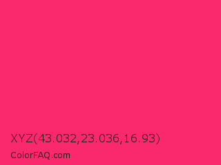 XYZ 43.032,23.036,16.93 Color is a normal rose color and the nearest color is Radical Red #ff355e. Hex code #fa296e and RGB value is rgb(250,41,110). In RGB color space, this color is composed of 98% red, 16% green, 43% blue, In CMYK color space, this color is composed of 0% cyan, 84% magenta, 56% yellow , 2% black , In HSL color space, this color has a hue angle of 340° , 95% saturation and 57% lightness.