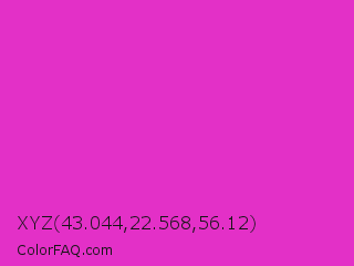 XYZ 43.044,22.568,56.12 Color is a normal magenta color and the nearest color is Steel Pink #cc33cc. Hex code #e330c7 and RGB value is rgb(227,48,199). In RGB color space, this color is composed of 89% red, 19% green, 78% blue, In CMYK color space, this color is composed of 0% cyan, 79% magenta, 12% yellow , 11% black , In HSL color space, this color has a hue angle of 309° , 76% saturation and 54% lightness.