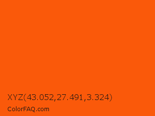 XYZ 43.052,27.491,3.324 Color is a normal orange color and the nearest color is Willpower Orange #fd5800. Hex code #fa590a and RGB value is rgb(250,89,10). In RGB color space, this color is composed of 98% red, 35% green, 4% blue, In CMYK color space, this color is composed of 0% cyan, 64% magenta, 96% yellow , 2% black , In HSL color space, this color has a hue angle of 20° , 96% saturation and 51% lightness.