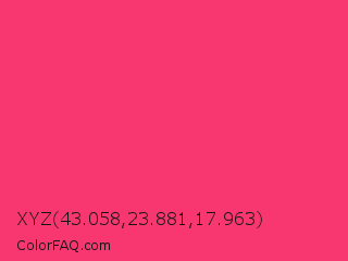 XYZ 43.058,23.881,17.963 Color is a normal rose color and the nearest color is Neon Fuchsia #fe4164. Hex code #f83771 and RGB value is rgb(248,55,113). In RGB color space, this color is composed of 97% red, 22% green, 44% blue, In CMYK color space, this color is composed of 0% cyan, 78% magenta, 54% yellow , 3% black , In HSL color space, this color has a hue angle of 342° , 93% saturation and 59% lightness.