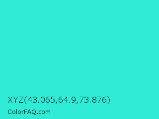 XYZ 43.065,64.9,73.876 Color is a normal cyan color and the nearest color is Turquoise #40e0d0. Hex code #30ebd6 and RGB value is rgb(48,235,214). In RGB color space, this color is composed of 19% red, 92% green, 84% blue, In CMYK color space, this color is composed of 80% cyan, 0% magenta, 9% yellow , 8% black , In HSL color space, this color has a hue angle of 173° , 82% saturation and 55% lightness.