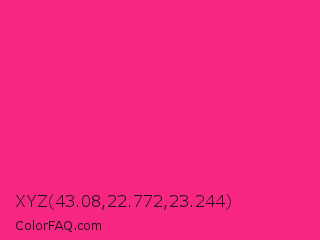 XYZ 43.08,22.772,23.244 Color is a normal rose color and the nearest color is Cerise Pink #ec3b83. Hex code #f72682 and RGB value is rgb(247,38,130). In RGB color space, this color is composed of 97% red, 15% green, 51% blue, In CMYK color space, this color is composed of 0% cyan, 85% magenta, 47% yellow , 3% black , In HSL color space, this color has a hue angle of 334° , 93% saturation and 56% lightness.