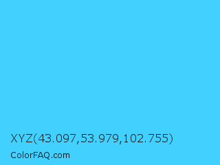 XYZ 43.097,53.979,102.755 Color is a light blue color and the nearest color is Picton Blue #45b1e8. Hex code #42d1ff and RGB value is rgb(66,209,255). In RGB color space, this color is composed of 26% red, 82% green, 100% blue, In CMYK color space, this color is composed of 74% cyan, 18% magenta, 0% yellow , 0% black , In HSL color space, this color has a hue angle of 195° , 100% saturation and 63% lightness.