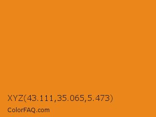XYZ 43.111,35.065,5.473 Color is a normal orange color and the nearest color is Zest #e5841b. Hex code #eb871a and RGB value is rgb(235,135,26). In RGB color space, this color is composed of 92% red, 53% green, 10% blue, In CMYK color space, this color is composed of 0% cyan, 43% magenta, 89% yellow , 8% black , In HSL color space, this color has a hue angle of 31° , 84% saturation and 51% lightness.