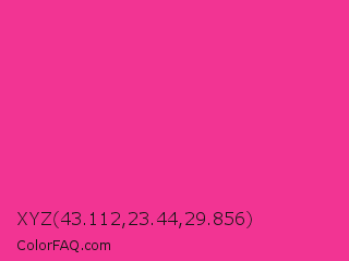 XYZ 43.112,23.44,29.856 Color is a normal rose color and the nearest color is Wild Strawberry Crayola #ff3399. Hex code #f23493 and RGB value is rgb(242,52,147). In RGB color space, this color is composed of 95% red, 20% green, 58% blue, In CMYK color space, this color is composed of 0% cyan, 79% magenta, 39% yellow , 5% black , In HSL color space, this color has a hue angle of 330° , 88% saturation and 58% lightness.
