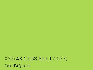 XYZ 43.13,58.893,17.077 Color is a normal green color and the nearest color is Conifer #acdd4d. Hex code #abd952 and RGB value is rgb(171,217,82). In RGB color space, this color is composed of 67% red, 85% green, 32% blue, In CMYK color space, this color is composed of 21% cyan, 0% magenta, 62% yellow , 15% black , In HSL color space, this color has a hue angle of 80° , 64% saturation and 59% lightness.