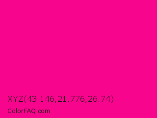 XYZ 43.146,21.776,26.74 Color is a normal magenta color and the nearest color is Magenta Process #ff0090. Hex code #f7058c and RGB value is rgb(247,5,140). In RGB color space, this color is composed of 97% red, 2% green, 55% blue, In CMYK color space, this color is composed of 0% cyan, 98% magenta, 43% yellow , 3% black , In HSL color space, this color has a hue angle of 327° , 96% saturation and 49% lightness.