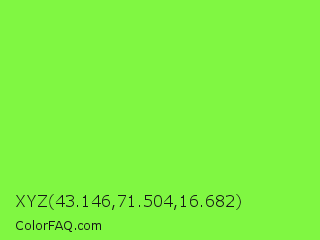 XYZ 43.146,71.504,16.682 Color is a light green color and the nearest color is Kiwi #8ee53f. Hex code #80f742 and RGB value is rgb(128,247,66). In RGB color space, this color is composed of 50% red, 97% green, 26% blue, In CMYK color space, this color is composed of 48% cyan, 0% magenta, 73% yellow , 3% black , In HSL color space, this color has a hue angle of 99° , 92% saturation and 61% lightness.