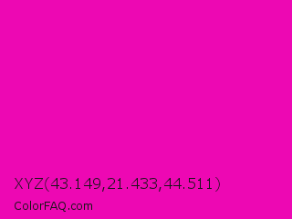 XYZ 43.149,21.433,44.511 Color is a normal magenta color and the nearest color is Hollywood Cerise #f400a1. Hex code #ed08b3 and RGB value is rgb(237,8,179). In RGB color space, this color is composed of 93% red, 3% green, 70% blue, In CMYK color space, this color is composed of 0% cyan, 97% magenta, 24% yellow , 7% black , In HSL color space, this color has a hue angle of 315° , 93% saturation and 48% lightness.