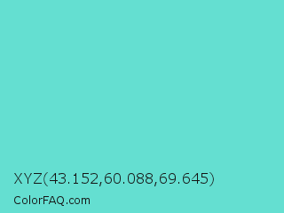 XYZ 43.152,60.088,69.645 Color is a light cyan color and the nearest color is Viking #64ccdb. Hex code #64dfd1 and RGB value is rgb(100,223,209). In RGB color space, this color is composed of 39% red, 87% green, 82% blue, In CMYK color space, this color is composed of 55% cyan, 0% magenta, 6% yellow , 13% black , In HSL color space, this color has a hue angle of 173° , 66% saturation and 63% lightness.
