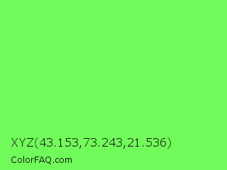 XYZ 43.153,73.243,21.536 Color is a light green color and the nearest color is Screamin Green #66ff66. Hex code #71fb5a and RGB value is rgb(113,251,90). In RGB color space, this color is composed of 44% red, 98% green, 35% blue, In CMYK color space, this color is composed of 55% cyan, 0% magenta, 64% yellow , 2% black , In HSL color space, this color has a hue angle of 111° , 95% saturation and 67% lightness.